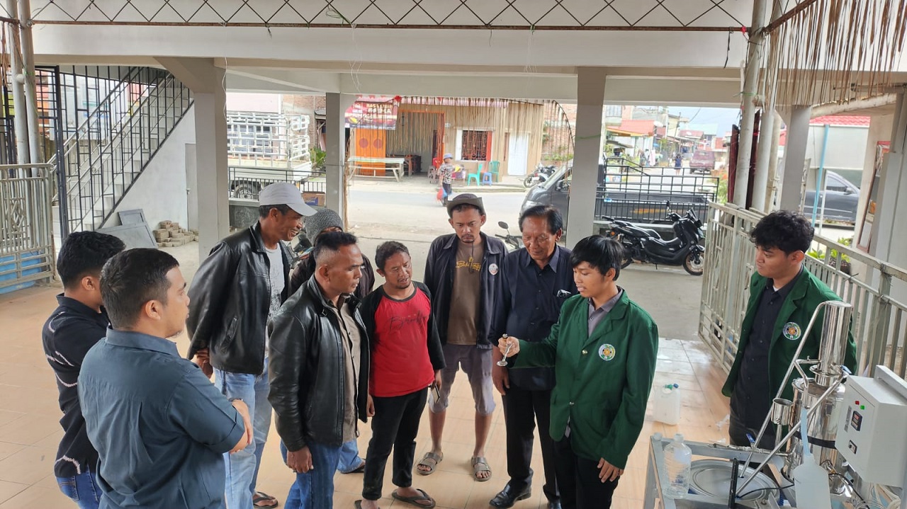 Setelah sesi materi, kegiatan dilanjutkan dengan demonstrasi proses pengolahan dan penyulingan bioetanol, yang berhasil menarik antusiasme serta partisipasi aktif dari warga setempat.
